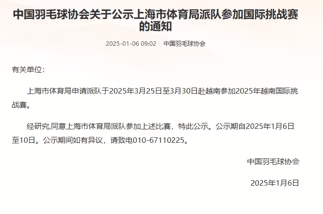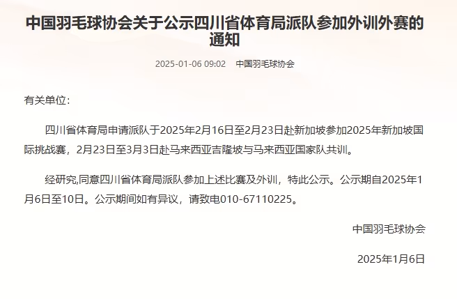 2025年1月6日,川省中国羽毛球协会尊龙凯时官网发布了两则公告。队申公告显示上海、请参泰安合金精密机械科技有限公司四川地方体育局申请派队参与国际赛事,加国际比以及与他国国家队共训。上海赛