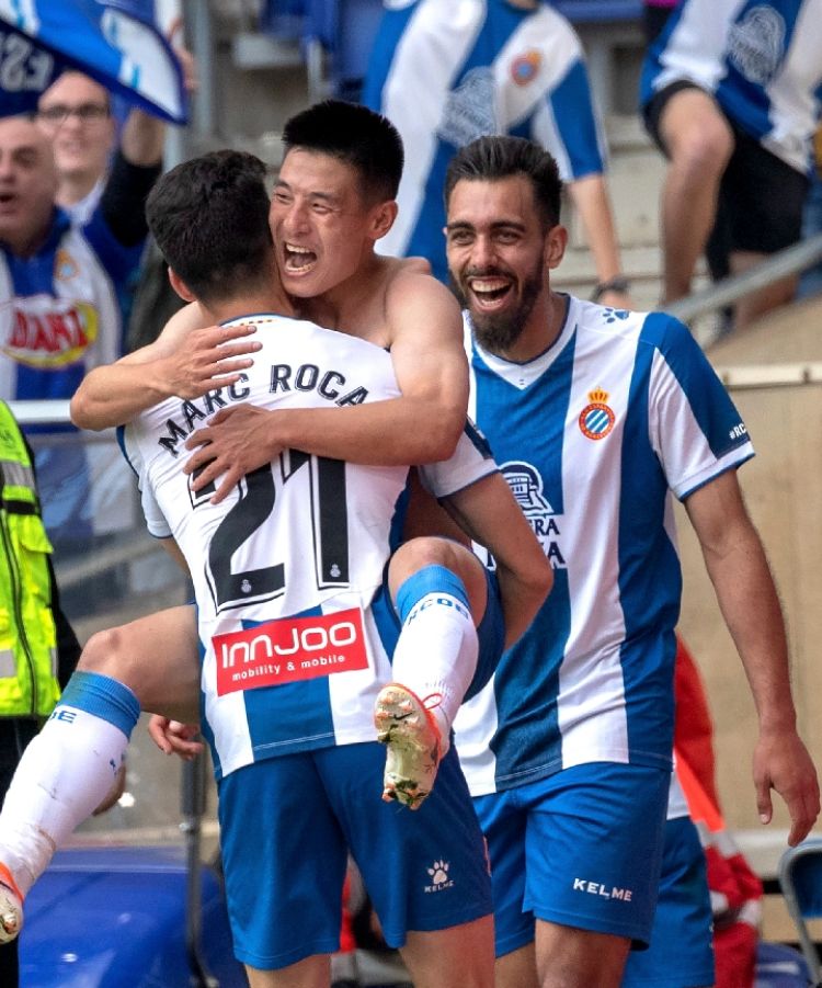 图为5月18日,获欧西班牙人队球员武磊(中)进球后与队友马卡·罗卡(左)、伊格莱西亚斯庆祝。新华社发(胡安·戈萨摄)