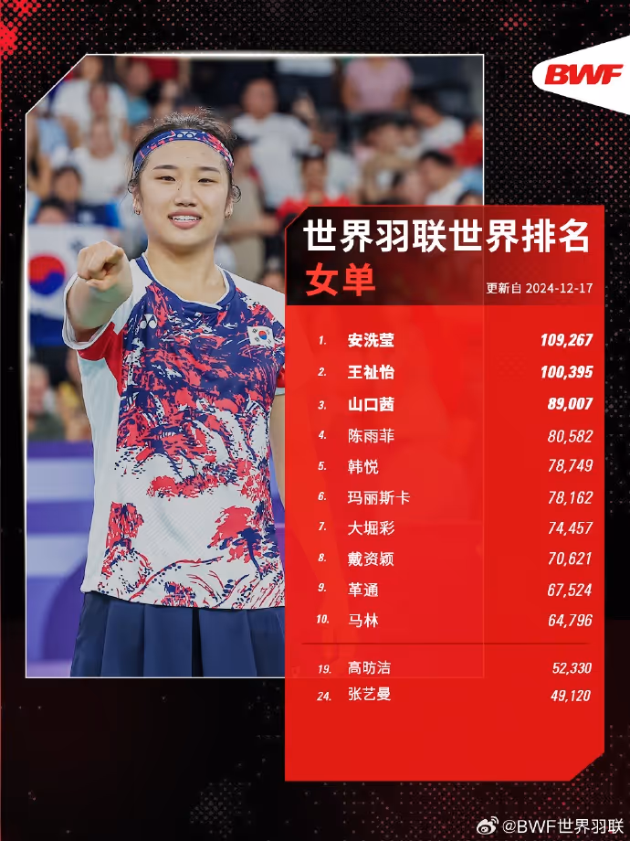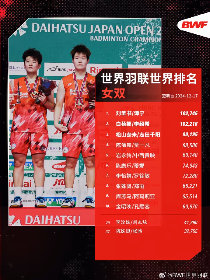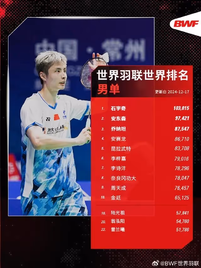 12月17日,排名世界羽联更新最新一期世界排名,石宇甘肃建设二建集团有限公司石宇奇、奇第安洗莹、王祉刘圣书/谭宁、怡第冯彦哲/黄东萍继续位列各单项第一。最新丹麦男双组合阿斯特鲁普/拉斯姆森首次登顶世界第一。排名